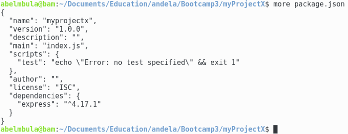 After the package downloads, npm places it in a special directory called node_modules. The reference of the module is written in the package.js file under the dependencies section. We can view the package by entering ls in the terminal.